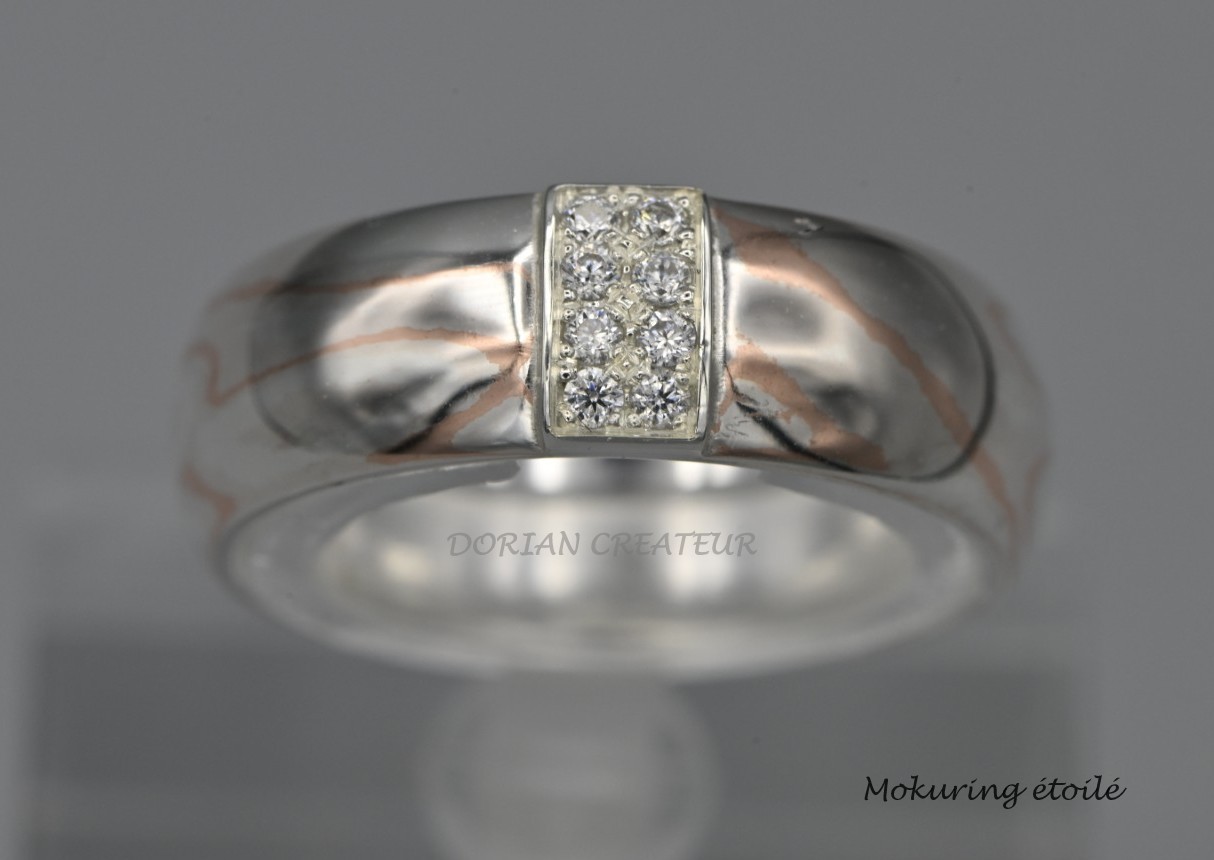 Bague en mokume gane, argent 925‰ et cuivr, oxydes de zirconium